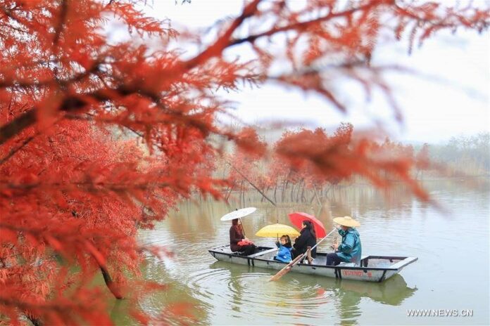ท่องเที่ยว ใบไม้ร่วงยังไม่ลาไป! ทะเลสาบเทียนฉวนในอ้อมกอดของสนเรดวูด 12 พฤศจิกายน 2016 180 FacebookTwitterWhatsAppTelegramLINE ชมภาพที่ถูกบันทึกไว้เมื่อวันที่ 11 พฤศจิกายน 2016 ของบรรดานักท่องเที่ยวที่นั่งเรือชมธรรมชาติอยู่ในทะเลสาบเทียนฉวน (天泉湖) อำเภอซวีอี้ มณฑลเจียงซู สาธารณรัฐประชาชนจีน ที่ถูกโอบล้อมไว้ด้วยสนเรดวูดสีแดงสดใสในฤดูใบไม้ร่วง