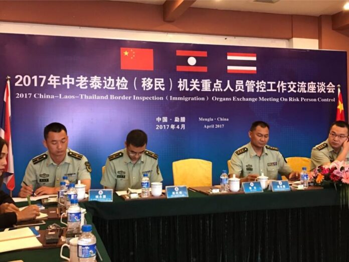 เมื่อวันที่ 6 เมายน 60 เวลา 09.00 น. ณ.ห้องประชุมที่เมืองหล้า เขตปกครองตนเองชนชาติไต สิบสองปันนา มณฑลยูนนาน ได้มีการประชุมร่วมของเจ้าหน้าที่ตรวจคนเข้าเมืองของ จีน ไทย ลาว ตม.10 ด่านตรวจของเจ้าหน้าที่ ตม.ด่าน 1.เชียงของ 2.ห้วยทราย 3.บ่อเต็น 4.บ่อหาน 5.สนามบินหลวงพระบาง 6.บ้านมอม 7.ท่าเรือจิ่งหง 8.สนามบินจิ่งหง 9.หนองคาย 10.อุดรธานี โดยมีการประชุมความร่วมมือและแลกเปลี่ยนความคิดเห็นระหว่างเจ้าหน้าที่ตรวจคนเข้าเมือทั้ง 3 ประเทศ 2017 China-Laos-Thailand Border Inspection (Immigration) Organs Exchang on Risk Person Control