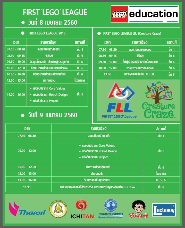 วิทยาลัยนวัตกรรมด้ านเทคโนโลยีและวิศวกรรมศาสตร์ (CITE) ร่วมกับ สถาบันพัฒนาการเรียนการสอนวิ ชาวิทยาศาสตร์และคณิตศาสตร์ (สพวค.) บริษัท แกมมาโก้ (ประเทศไทย) จำกัด และสำนักงานคณะกรรมการการศึ กษาขั้นพื้นฐาน (สพฐ.) ร่วมกันเป็นเจ้าภาพในการจั ดโครงการการแข่งขันหุ่นยนต์ First LEGO League 2016 Thailand (FLL 2016) ในวันเสาร์ที่ 8 และวันอาทิตย์ที่ 9 เมษายน 2560 เวลา 7.30 – 16.30 น. ณ ห้องปรีดี พนมยงค์ อาคาร 7 ชั้น 6 ซึ่งเป็นโครงการแข่งขันหุ่นยนต์ ระดับประเทศเพื่อคัดเลือกตั วแทนไปแข่งขันหุ่นยนต์ระดั บโลกที่ประเทศออสเตรเลีย
