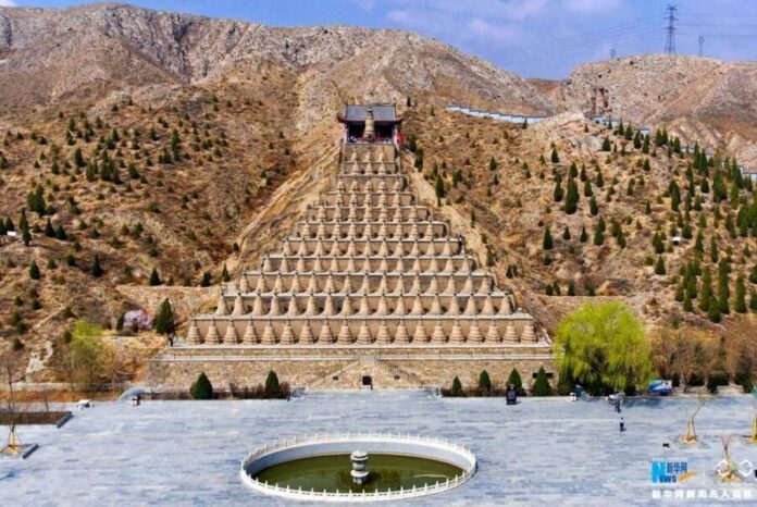 ที่เนินเขาแห่งหนึ่งในเมืองชิงถงเสีย เขตปกครองตนเองหนิงเซี่ยหุยทางภาคตะวันตกเฉียงเหนือของประเทศจีน มีกลุ่มเจดีย์โบราณ 108 องค์ตั้งเรียงรายอยู่ โดยตั้งอยู่บนเนินเขาทางทิศตะวันตกและหันหน้าออกไปทางทิศตะวันออก ด้านหลังเป็นภูเขา ด้านหน้ามีบ่อน้ำ ซึ่งเป็นฮวงจุ้ยที่ดีมาก