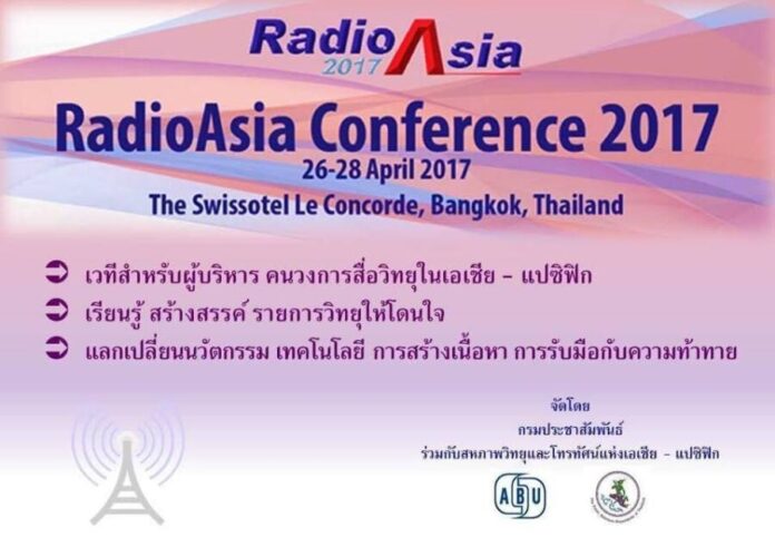 การประชุม Radio Asia 2017 Conference ในครั้งนี้ จัดขึ้นในวันที่ 26-28 เมษายน 2560 โดยสำนักการประชาสัมพันธ์ต่างประเทศ กรมประชาสัมพันธ์ โดยเป็นการประชุมประจำปีด้านวิทยุกระจายเสียงระดับภูมิภาคเอเชีย-แปซิฟิก เพื่อแลกเปลี่ยนวิทยาการเทคโนโลยีด้านวิทยุกระจายเสียงและการสื่อสารมวลชนที่เกี่ยวข้อง รวมทั้งสร้างเครือข่ายความร่วมมือกับต่างประเทศ