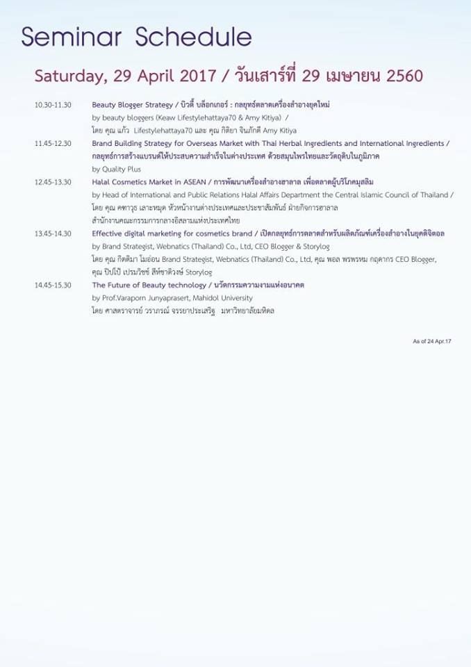 งานแสดงสินค้าและสัมมนาด้านความงามสำหรับภูมิภาคอาเซียน จัดขึ้นระหว่างวันที่ 27 – 29 เมษายน 2560 เวลา: 10.00 – 18.00 น. ณ ฮอลล์ 103 ศูนย์นิทรรศการและการประชุมไบเทค บางนา (BITEC) โดยมีพาวิลเลียนจากประเทศจีนเข้าร่วมแสดงในงาน
