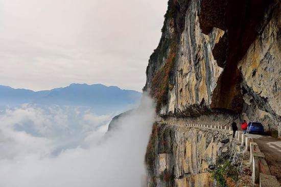 ที่หมู่บ้านซวงผิง ตำบลหม่านเย่ว์ เขตไคโจว นครฉงชิ่ง มีถนนพิเศษสายหนึ่งที่เลี้ยวลดคดเคี้ยวบนเขาสูงและอยู่เหนือระดับน้ำทะเลถึง1,500 เมตร ถนนสายนี้เมื่อมองไปข้างบนจะเห็นหินผา มองไปด้านล่างจะเห็นหมู่เมฆและเหวลึก ความน่าหวาดเสียวนี้เองทำให้มันได้ชื่อว่าเป็น “เส้นทางเสียดฟ้าบนผาชัน”