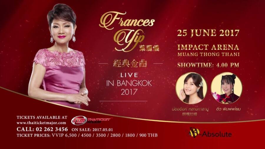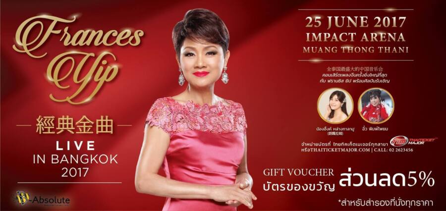 คอนเสิร์ตเพลงจีนที่ยิ่งใหญ่ที่สุดที่เคยเกิดขึ้นในประเทศไทย รับฟังบทเพลงจีนแสนไพเราะที่ยังอยู่ในความทรงจำ ผ่านเส้นเสียงศิลปินระดับดีว่าแห่งเอเชีย “Frances Yip” เจ้าของตำนานเพลง “เจ้าพ่อเซี่ยงไฮ้” พบคอนเสิร์ตครั้งสำคัญที่ดีที่สุดจากเธอคนนี้ เพลิดเพลินกับการรับชม และรับฟังบทเพลงจีนในความทรงจำ เช่น