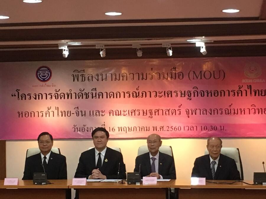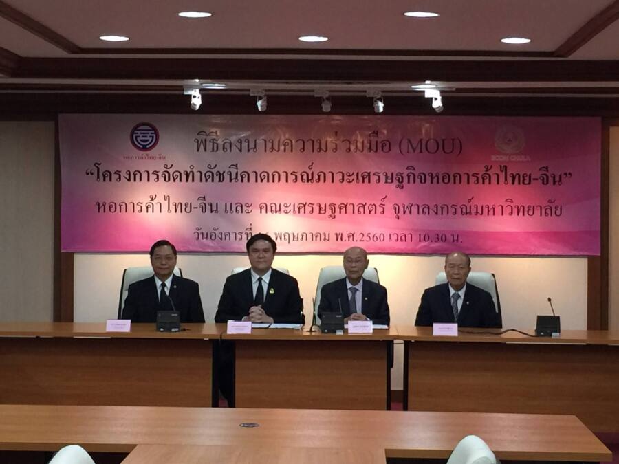 หอการค้าไทย-จีน ได้มีการลงนามความร่วมมือ (MOU) กับ คณะเศรษฐศาสตร์จุฬาฯ ในการจัดทำดัชนีคาดการณ์ภาวะเศรษฐกิจหอการค้าไทย-จีน อย่างเป็นทางการ เพื่อสำรวจทัศนะของผู้ประกอบการธุรกิจที่เป็นสมาชิกหอการค้าไทย – จีน 230 แห่ง และสมาพันธ์หอการค้าไทย-จีน จำนวน 36 สมาพันธ์ ที่มีสมาชิกรวมประมาณ 9,000 แห่ง โดยบริษัทศูนย์วิจัยเพื่อการพัฒนาสังคมและธุรกิจ จำกัด จัดเก็บข้อมูลนักธุรกิจไทย – จีน จำนวน 550 คน เพื่อสะท้อนมุมมองเศรษฐกิจไทยที่เกิดขึ้นจริงรายไตรมาส ซึ่งคาดว่าจะแถลงดัชนีคาดการณ์ภาวะเศรษฐกิจหอการค้าไทย-จีน ครั้งแรกในปลายไตรมาส 3 ปีนี้ หรือประมาณเดือนกันยายน โดยจัดทำเป็น 3 ภาษา คือ ไทย จีน และอังกฤษ และ ประกาศพร้อมจะเผยแพร่มุมมองทัศนคติสะท้อนภาวะเศรษฐกิจได้เป็นครั้งแรก ในช่วงไตรมาสที่3ของปีนี้