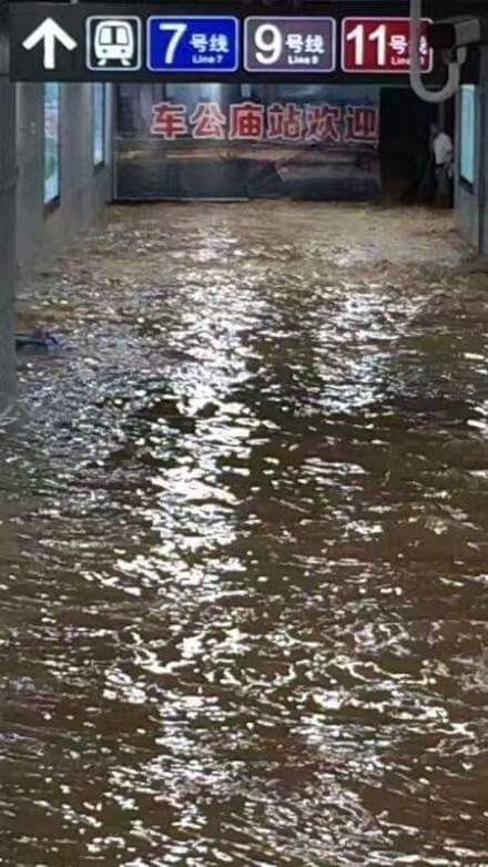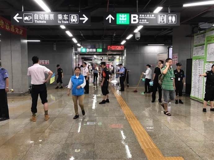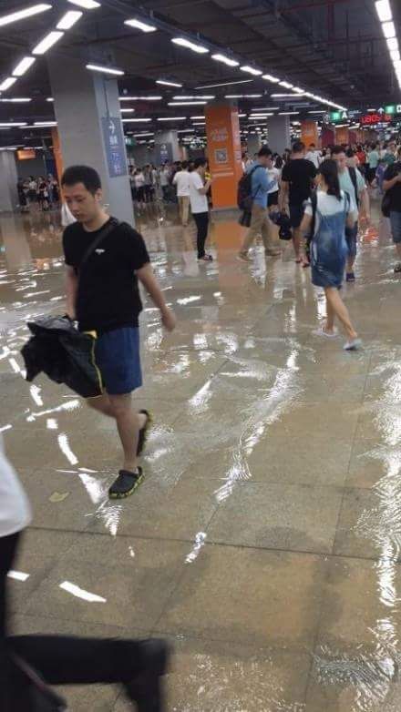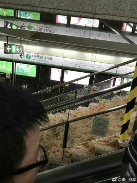 ในรูปคือภาพน้ำขังบริเวณห้องโถง สถานีรถไฟฟ้าใต้ดิน เชอกงเหมียว ที่มีน้ำไหลลงมาจากบันไดเลื่อนเป็นจำนวนมากจนทั้งห้องโถงกลายเป็นพื้นที่น้ำท่วมขัง