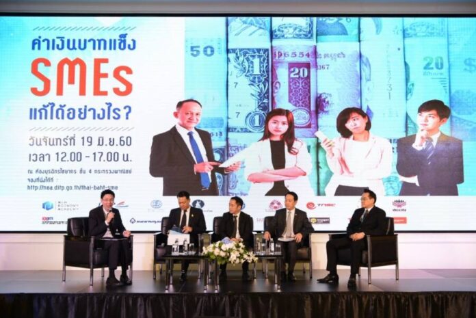 นางอภิรดี ตันตราภรณ์ รัฐมนตรีว่าการกระทรวงพาณิชย์ มอบหมายให้ผู้ช่วยรัฐมนตรีประจำกระทรวงพาณิชย์ นายวินิจฉัย แจ่มแจ้ง เป็นประธานเปิดงานเสวนา “ค่าเงินบาทแข็ง SMEs แก้ได้อย่างไร” ณ ห้องบุรฉัตรไชยากร ชั้น 4 กระทรวงพาณิชย์ ซึ่งกระทรวงพาณิชย์ โดยสถาบัน NEA กรมส่งเสริมการค้าระหว่างประเทศ ร่วมกับธนาคารแห่งประเทศไทย สภาหอการค้าแห่งประเทศไทย สภาอุตสาหกรรมแห่งประเทศไทย สภาผู้ส่งสินค้าทางเรือแห่งประเทศไทย สมาคมธนาคารไทย ธนาคารเพื่อการส่งออกและนำเข้าแห่งประเทศไทย (EXIM Bank) และธนาคารที่เป็นพันธมิตรจัดขึ้น เพื่อให้ความรู้ แนวคิด เทคนิคการบริหารจัดการความเสี่ยงด้านค่าเงินบาทที่แข็งค่าขึ้นอย่างต่อเนื่องแก่ผู้ประกอบการเอสเอ็มอีในธุรกิจส่งออก-นำเข้า ที่ได้รับผลกระทบจากความผันผวนของค่าเงิน รวมทั้งผู้สนใจที่ต้องการเตรียมความพร้อมก่อนการดำเนินธุรกิจนำเข้า-ส่งออกอย่างจริงจัง