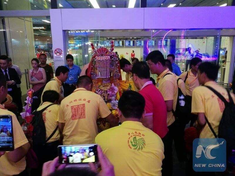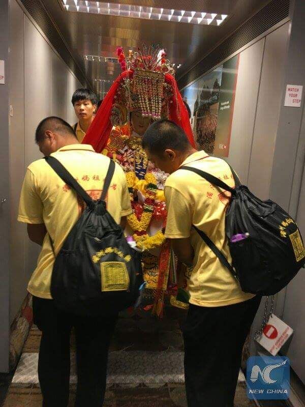 ชมภาพที่ถูกบันทึกไว้ในวันที่ 7 กรกฎาคม 2017 ของรูปปั้น “เจ้าแม่ม๋าโจ้ว” เทพเจ้าแห่งท้องทะเลจีน พร้อมรูปปั้นเทพเจ้า “เชียนหลีเยี่ยน” (ตาพันลี้) และ “สุ้นเฟิงเอ่อร์” (หูตามลม) ที่กลับมายังประเทศจีนแล้ว หลังจากถูกอัญเชิญไปยังประเทศสิงคโปร์ เป็นเวลา 2 สัปดาห์ ซึ่งตั๋วที่นั่งชั้นธุรกิจของเทพเจ้าแต่ละองค์นั้น มีมูลค่าสูงถึงประมาณ 2,090 หยวน (ราว 10,470 บาท) เลยทีเดียว