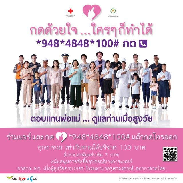 มารวมพลังร่วมเป็นส่วนหนึ่งในการเตรียมความพร้อมเพื่อดูแลผู้สูงวัยในสังคมไทย กับโครงการ “กดด้วยใจ ใครๆ ก็ทำได้” กับ โรงพยาบาลจุฬาลงกรณ์ สภากาชาดไทย ด้วยการบริจาคเงิน 100 บาท เพียงกด *948*4848*100#