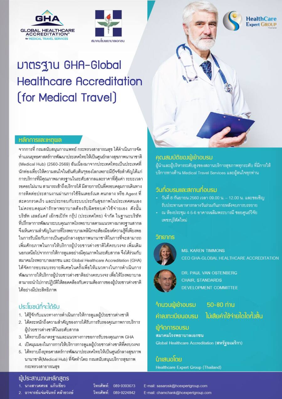ในการรับมือกับการเป็นศูนย์กลางสุขภาพนานาชาติในการที่จะสามารถเพิ่มศักยภาพในการให้บริการผู้ป่วยชาวต่างชาติได้ครบวงจรเพิ่มเติม นอกเหนือไปจากการให้การดูแลอย่างมีคุณภาพในระดับสากล จึงได้ร่วมกับ สมาคมโรงพยาบาลเอกชน และ Global Healthcare Accreditation (GHA) ได้จัดการอบรมบรรยายพิเศษเรื่องนี้เพื่อให้แนวทางในการดำเนินการพัฒนาการให้บริการผู้ป่วยชาวต่างชาติอย่างครบวงจร เพื่อให้โรงพยาบาลสามารถนำไปการปฏิบัติให้สอดคล้องกับความต้องการของผู้ป่วยชาวต่างชาติได้อย่างมีประสิทธิภาพ