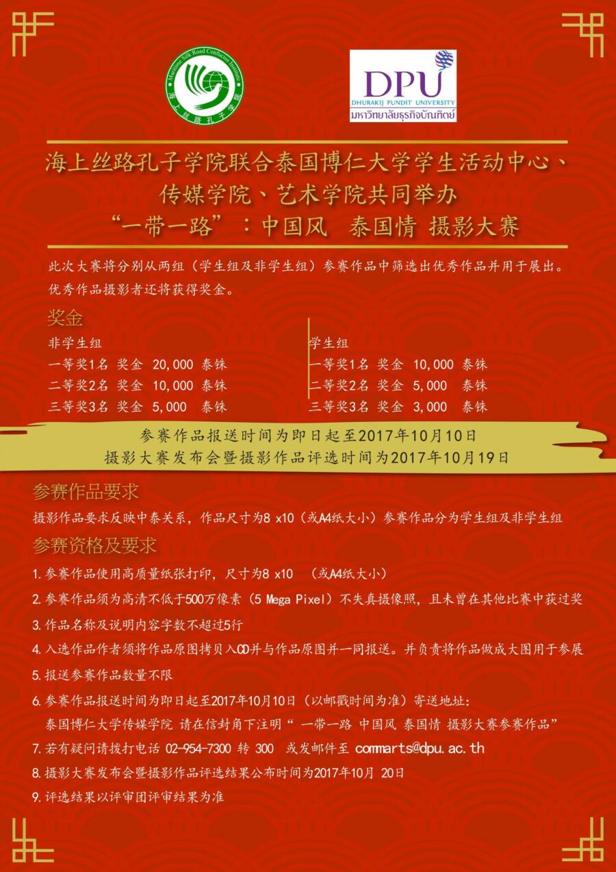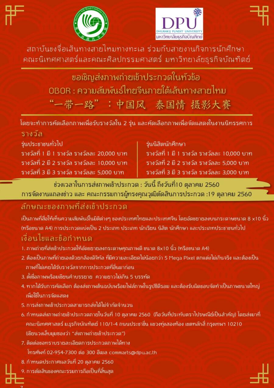 สถาบันขงจื่อเส้นทางสายไหมทางทะเล ร่วมกับสายงานกิจการนักศึกษา คณะนิเทศศาสตร์และคณะศิลปกรรมศาสตร์ มหาวิทยาลัยธุรกิจบัณฑิตย์ เชิญชวนผู้ที่สนใจส่งภาพถ่ายเข้าประกวดในหัวข้อ “OBOR : ความสัมพันธ์ไทยจีนภายใต้เส้นทางสายไหม” โดยจะคัดเลือกภาพเพื่อรับรางวัลใน 2 รุ่น และคัดเลือกภาพเพื่อจัดแสดงในงานนิทรรศการ