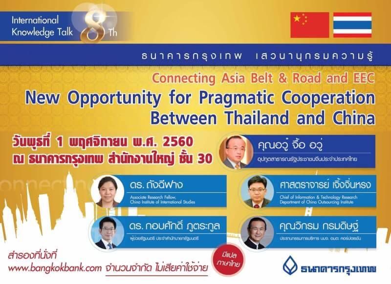 เมื่อวันที่ 1 พฤศจิกายน 2560 ธนาคารกรุงเทพจัดงานเสวนานุกรมความรู้ครั้งที่ 8 ในหัวข้อ “Connecting Asia: New Opportunity for Pragmatic Cooperation Between Thailand and China” ณ ห้องประชุมชั้น 30 สำนักงานใหญ่ธนาคารกรุงเทพ โดยมีคุณชาติศิริ โสภณพนิช กรรมการผู้จัดการใหญ่ ธนาคารกรุงเทพ จำกัด (มหาชน) กล่าวต้อนรับและได้เชิญวิทยากรผู้เชี่ยวชาญจากจีนและไทยมาร่วมให้ความรู้และแบ่งปันประสบการณ์