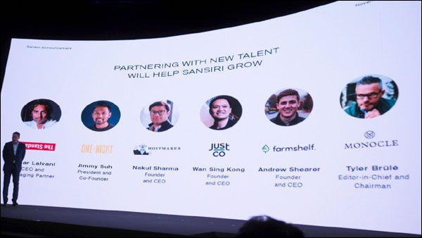แสนสิริได้เปิดตัว 6 ธุรกิจพันธมิตรที่ได้ร่วมลงทุน ประกอบไปด้วย 1.เดอะ สแตนดาร์ด (The Standard) โดยนายอามาร์ ลาลวานี ซีอีโอแบรนด์ที่ทรงพลังที่สุดในธุรกิจบูติกโฮเทล 2.One Night โดย นายจิมมี่ ซูฮ์ ประธานบริหารแอพพลิเคชั่นจองห้องพัก,โรงแรมแบบนาทีสุดท้าย 3.โฮสต์ เมกเกอร์ (Hostmaker) โดยนายนกุล ซาร์มา ผู้ก่อตั้งและซีอีโอธุรกิจให้บริการจัดการเช่าที่พักในหลายประเทศ 4.จัสท์โค (Just Co) โดยนายคง วัน ซิง ผู้ให้บริการโคเวิร์คกิ้ง สเปซระดับพรีเมียมที่ใหญ่ที่สุดในเอเชียตะวันออกเฉียงใต้ 5.ฟาร์มเชลท์ (Farmshelf) โดยนายแอนดรู เชียเรอร์ ผู้ร่วมก่อตั้งและประธานบริหาร ฟาร์มอัจฉริยะเพื่อการปลูกผักสดสะอาดในที่พักอาศัย และ 6.โมโนเคิล (Monocle) โดยนายไทเลอร์ บรูเล่ บรรณาธิการใหญ่และประธานบริษัท สื่อไลฟ์สไตล์ที่ได้รับการยอมรับระดับโลก