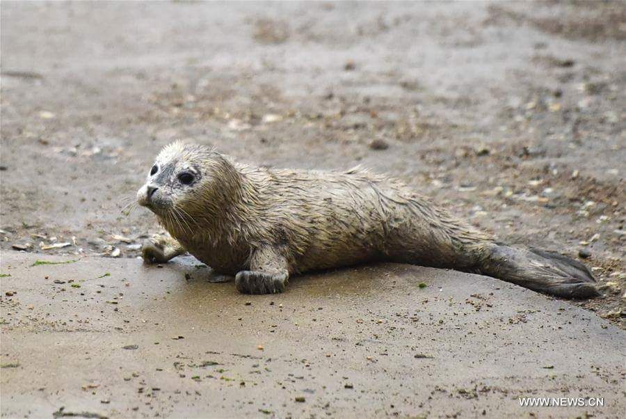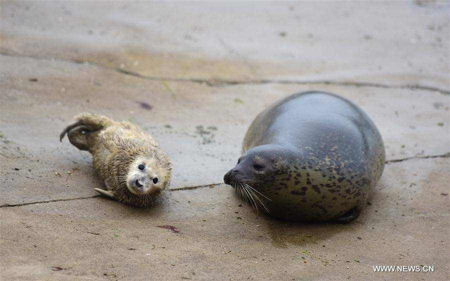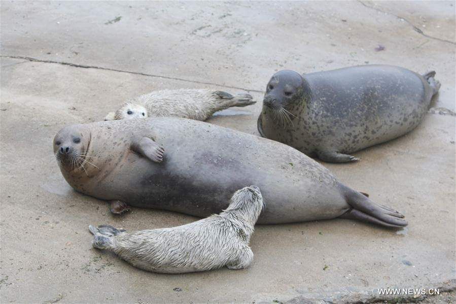 ชมภาพที่ถูกบันทึกไว้ในวันที่ 1 มีนาคม 2017ของแมวน้ำลายจุดแรกเกิดทั้งสามตัว ที่ได้ออกมาเผยตัวต่อหน้าสาธารณชนในอ่าวแมวน้ำ เมืองเยียนไถ มณฑลซานตง ทางตะวันออกของประเทศจีน