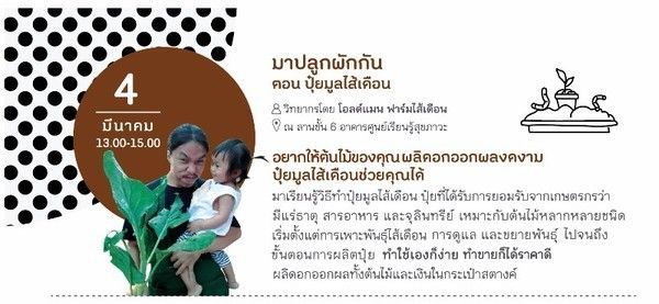 วันเสาร์ ที่ 4 มีนาคม ถ้าอยากให้ต้นไม้ ผลิดอกออกผลงดงาม ปุ๋ยมูลไส้เดือนช่วยได้ กับกิจกรรม มาปลูกผักกัน ตอน ปุ๋ยมูลไส้เดือน มาเรียนรู้วิธีทำปุ๋ยมูลไส้เดือน เริ่มตั้งแต่การเพาะพันธุ์ไส้เดือนที่มีทั้งพันธุ์สำหรับเลี้ยงพืชและเลี้ยงสัตว์ การดูแล และขยายพันธุ์ ไปจนถึงขั้นตอนการผลิตปุ๋ย ทำใช้เองก็ง่าย ทำขายก็ได้ราคาดี