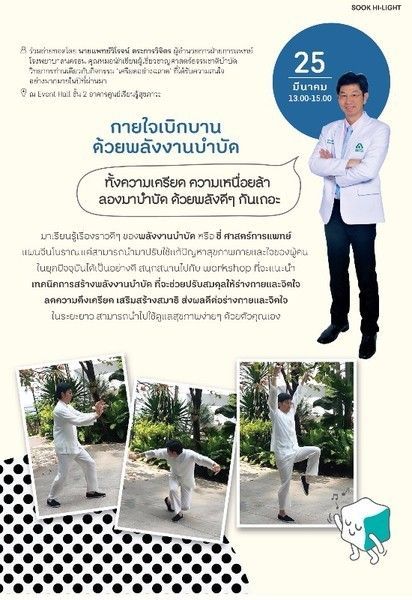 วันเสาร์ที่ 25 มีนาคม เติมพลังความสดชื่นให้ร่างกายกับกิจกรรม กายใจเบิกบาน ด้วยพลังงานบำบัด เรียนรู้ประโยชน์ดีๆ ของพลังงานบำบัด หรือ ชี่ ศาสตร์การแพทย์แผนจีนโบราณ แต่สามารถนำมาปรับใช้แก้ปัญหาสุขภาพกายและใจของผู้คนในยุคปัจจุบันได้เป็นอย่างดี ร่วมแบ่งปันความรู้โดย นายแพทย์วิโรจน์ ตระการวิจิตร ผู้อำนวยการฝ่ายการแพทย์โรงพยาบาลนครธน และยังเป็นคุณหมอนักเขียนผู้เชี่ยวชาญศาสตร์ธรรมชาติบำบัด ที่จะมาแนะนำเทคนิคการสร้างพลังงานบำบัด ซึ่งจะช่วยปรับสมดุลให้ร่างกายและจิตใจ ลดความตึงเครียด เสริมสร้างสมาธิ ส่งผลดีต่อร่างกายและจิตใจในระยะยาว ทั้งยังสามารถนำไปใช้ดูแลสุขภาพง่ายๆ ด้วยตัวเอง
