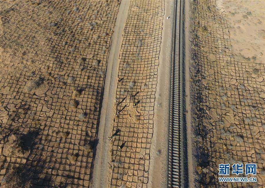 ภาพพนักงานจากกรมรถไฟเมืองฮูเหอเฮ่าเท่อกำลังทำความสะอาดทรายทางรถไฟหลินเช่อที่พาดผ่านทะเลทรายโกบี (戈壁) ในมองโกเลียใน