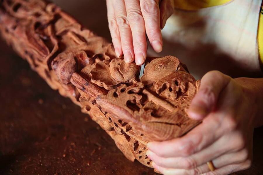 การแกะสลักไม้สื่อความหมายถึงความเป็นสิริมงคล โชคลาภและสันติภาพ โดยนิยมแกะเป็นรูปสัตว์หรือดอกไม้และจะแกะสลักเป็นรูปทรงหลายมิติ นับเป็นศิลปะที่มีสุนทรียศาสตร์อันโดดเด่นไม่เหมือนใคร