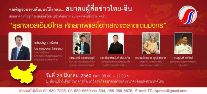 สมาคมผู้สื่อข่าวไทย-จีน ขอเชิญร่วมสัมมนาโต๊ะกลม “ธุรกิจเอสเอ็มอีไทย ศักยภาพและโอกาสเจาะตลาดแดนมังกร” ในวันที่ 29 มีนาคม 2560 เวลา 8.00-12.00 น. ณ ห้องแก้ววิเชียร ธนาคารพัฒนาวิสาหกิจขนาดกลางและขนาดย่อมแห่งประเทศไทย : SME BANK (อาคาร SME Bank ถนนพหลโยธิน BTS อารีย์)