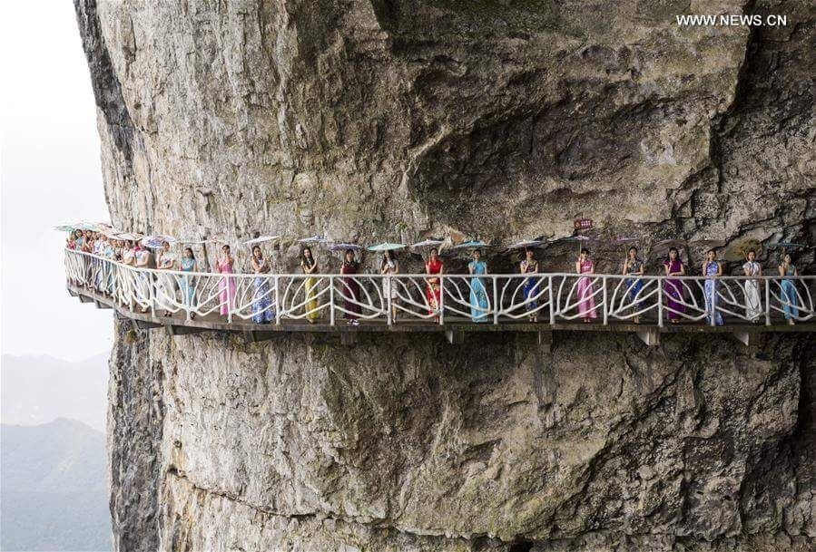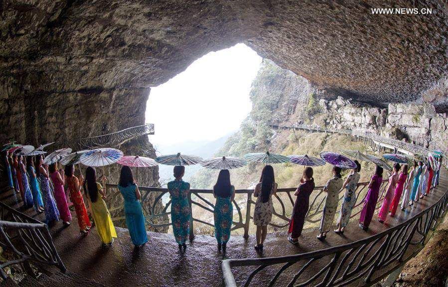 ชมภาพที่ถูกบันทึกไว้ในวันที่ 26 มีนาคม 2017ของเหล่าสาวงามที่ชวนกันมาเดินแฟชันบนถนนที่สร้างขึ้นตามแนวผาของภูเขาจินโฝ เขตเทศบาลนครฉงชิ่ง ทางตะวันตกเฉียงใต้ของประเทศจีน ทำให้หน้าผาที่ดูแข็งทื่อไร้ชีวิตชีวาแห่งนี้สดใสขึ้นด้วยสีสันจากชุดกี่เผ้าและร่มกระดาษ ราวกับมีดอกไม้ประดับประดาอยู่รายรอบเลยทีเดียว