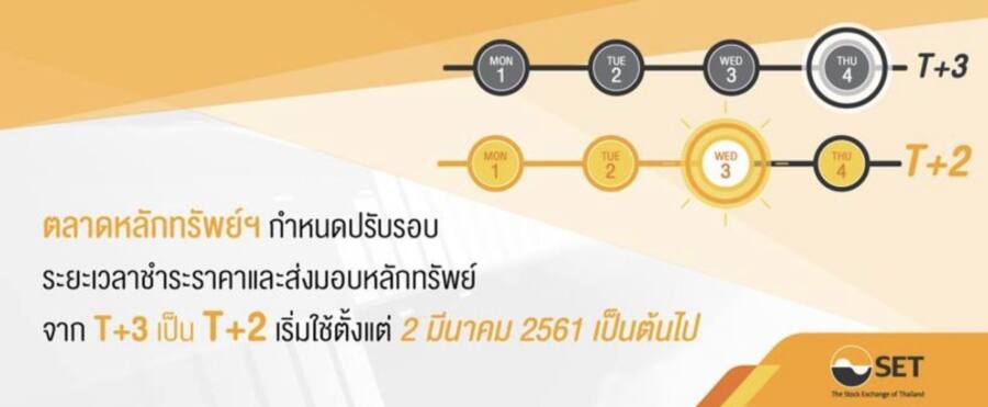 โดยทั่วไปแล้ว เมื่อนักลงทุนทำการซื้อหรือขายหุ้นในตลาดหลักทรัพย์แห่งประเทศไทย (SET) และตลาดหลักทรัพย์ เอ็ม เอ ไอ (mai) เราเรียกว่าวัน t ซึ่งจะมีระยะในการตัดเงินเพื่อชำระค่าหุ้น และรับหุ้นเข้าพอร์ตในวันทำการที่ 3 หลังจากวันที่ซื้อขายหุ้น หรือเรียกว่ารอบระยะเวลาชำระราคาและส่งมอบหลักทรัพย์ (Settlement Cycle) ที่ t+3 แต่เมื่อเร็วๆนี้ SET ได้ประกาศปรับระยะเวลาการชำระราคาและการส่งมอบหลักทรัพย์ ให้เร็วขึ้น จาก t+3 เหลือ t+2 โดยเริ่มใช้ 2 มีนาคม 2561