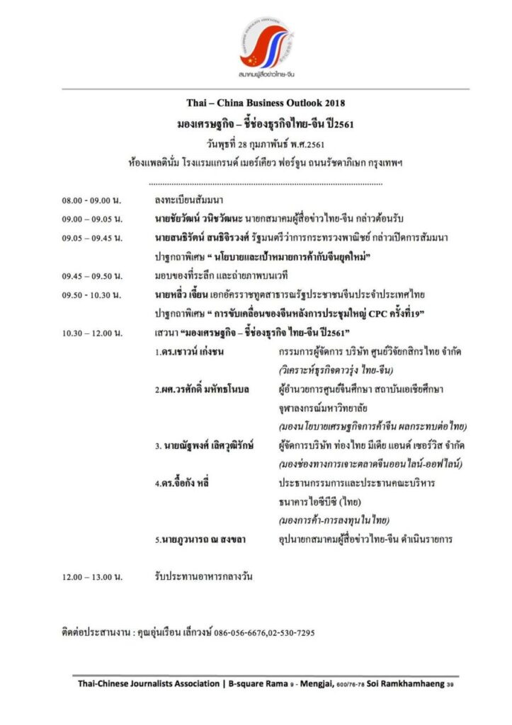 สมาคมผู้สื่อข่าวไทย-จีน จัดสัมมนาวิชา เรื่อง Thai – China Business Outlook 2018 มองเศรษฐกิจ… ชี้ช่องธุรกิจไทย-จีน ปี 2561 ในวันพุธที่ 28 กุมภาพันธ์ 2561 เวลา 08.00-12.00 ณ โรงแรมแกรนด์ เมอร์เคียว ฟอร์จูน ถนนรัชดาภิเษก กรุงเทพฯ