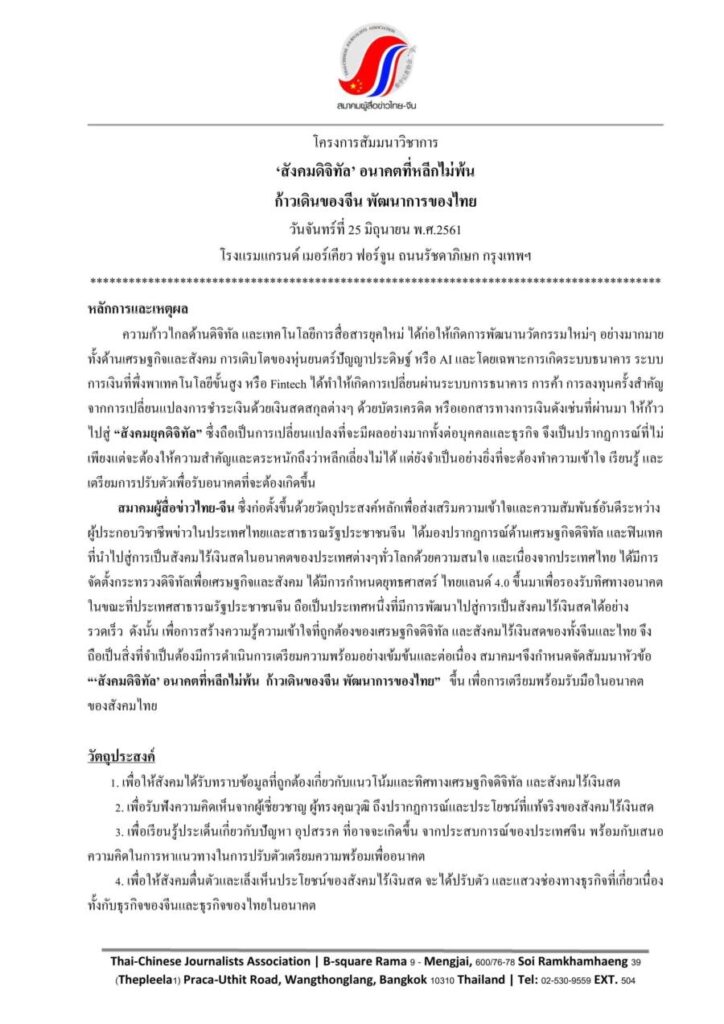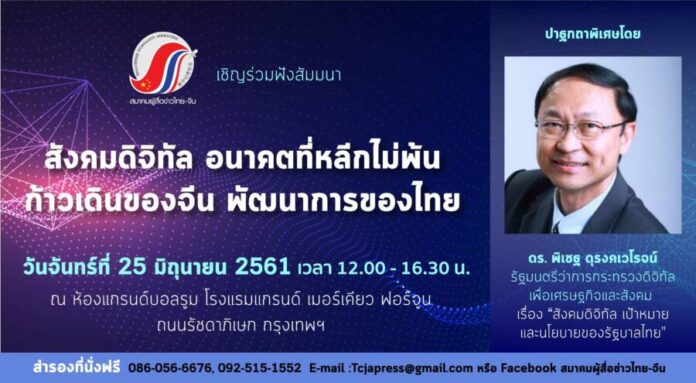 สมาคมผู้สื่อข่าวไทย-จีน เชิญร่วมงานสัมมนา “สังคมดิจิทัล อนาคตที่หลีกไม่พ้น…ก้าวเดินของจีน พัฒนาการของไทย” ในวันที่ 25 มิถุนายน พ.ศ.2561 เวลา 12.00-16.30 น ณ โรงแรมแกรนด์ เมอร์เคียว ฟอร์จูน ถนนรัชดาภิเษก กรุงเทพฯ