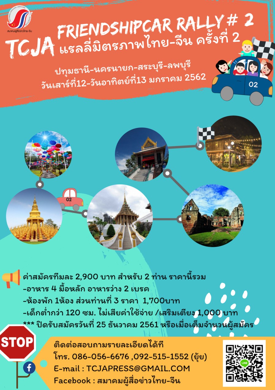 สมาคมผู้สื่อข่าวไทย-จีน จัดกิจกรรม ทีซีเจเอแรลลี่ มิตรไทย-จีน ครั้งที่ 2 ในวันเสาร์ที่ 12 – วันอาทิตย์ที่ 13 มกราคม 2562 สนใจสมัครได้ตามรายละเอียดด้านล่างเลย ช้าหมดอดนะจร้า (จำนวนมีจำกัด) โดยกิจกรรมครั้งนี้พาไปถึง 4 จังหวัด ได้แก่ กรุงเทพ(ปทุมธานี)-นครนายก-สะบุรี-ลพบุรี