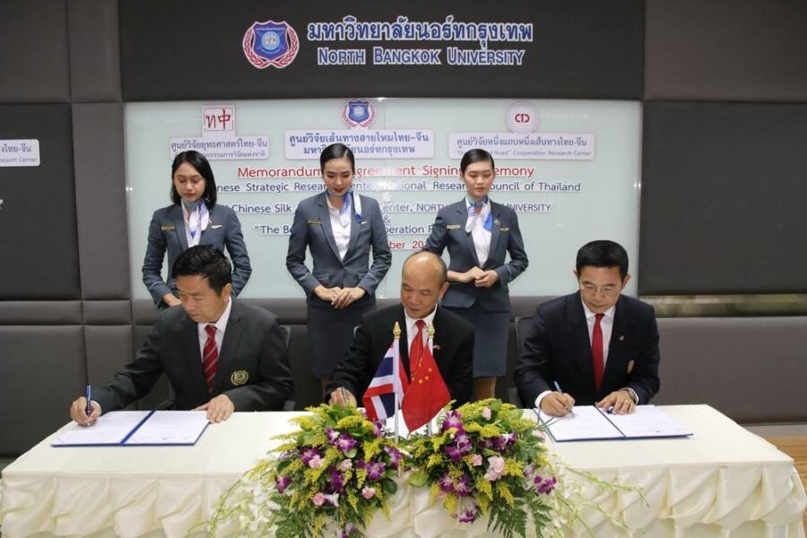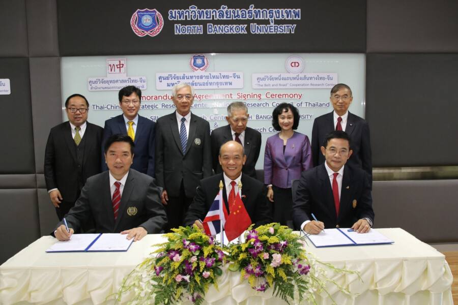 หลังจากพิธีเปิดศูนย์วิจัยเส้นทางสายไหมไทย – จีน ดร.สิทธิพร ประวัติรุ่งเรือง รองอธิการบดีฝ่ายวิชาการ มหาวิทยาลัยนอร์ทกรุงเทพ พล.อ. สุรสิทธิ์ ถนัดทาง ผู้อำนวยการศูนย์วิจัยยุทธศาสตร์ไทย – จีน สำนักงานคณะกรรมการวิจัยแห่งชาติ และ คุณพัฒนา สิทธิสมบัติ ผู้อำนวยการศูนย์วิจัยหนึ่งแถบหนึ่งเส้นทางไทย – จีน ได้ลงนามบันทึกข้อตกลงร่วมกัน ในด้านการร่วมมือกันกับศูนย์วิจัยเส้นทางสายไหมไทย – จีน โดยมีวัตถุประสงค์เพื่อดำเนินการเกี่ยวกับการศึกษาวิจัยในทุกรูปแบบที่เกี่ยวข้องกับการศึกษายุทธศาสตร์และนโยบาย เพื่อส่งเสริมการศึกษาวิจัยในประเด็นที่เกี่ยวข้องกับยุทธศาสตร์ไทย – จีน และเผยแพร่ความรู้สู่สาธารณชน ออกแบบเชิงนโยบายแก่รัฐบาล