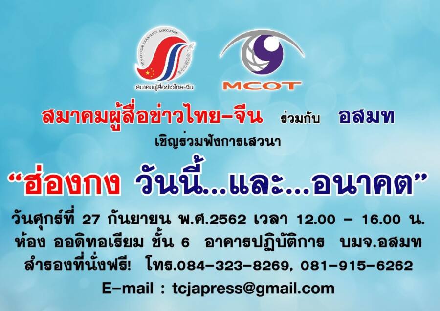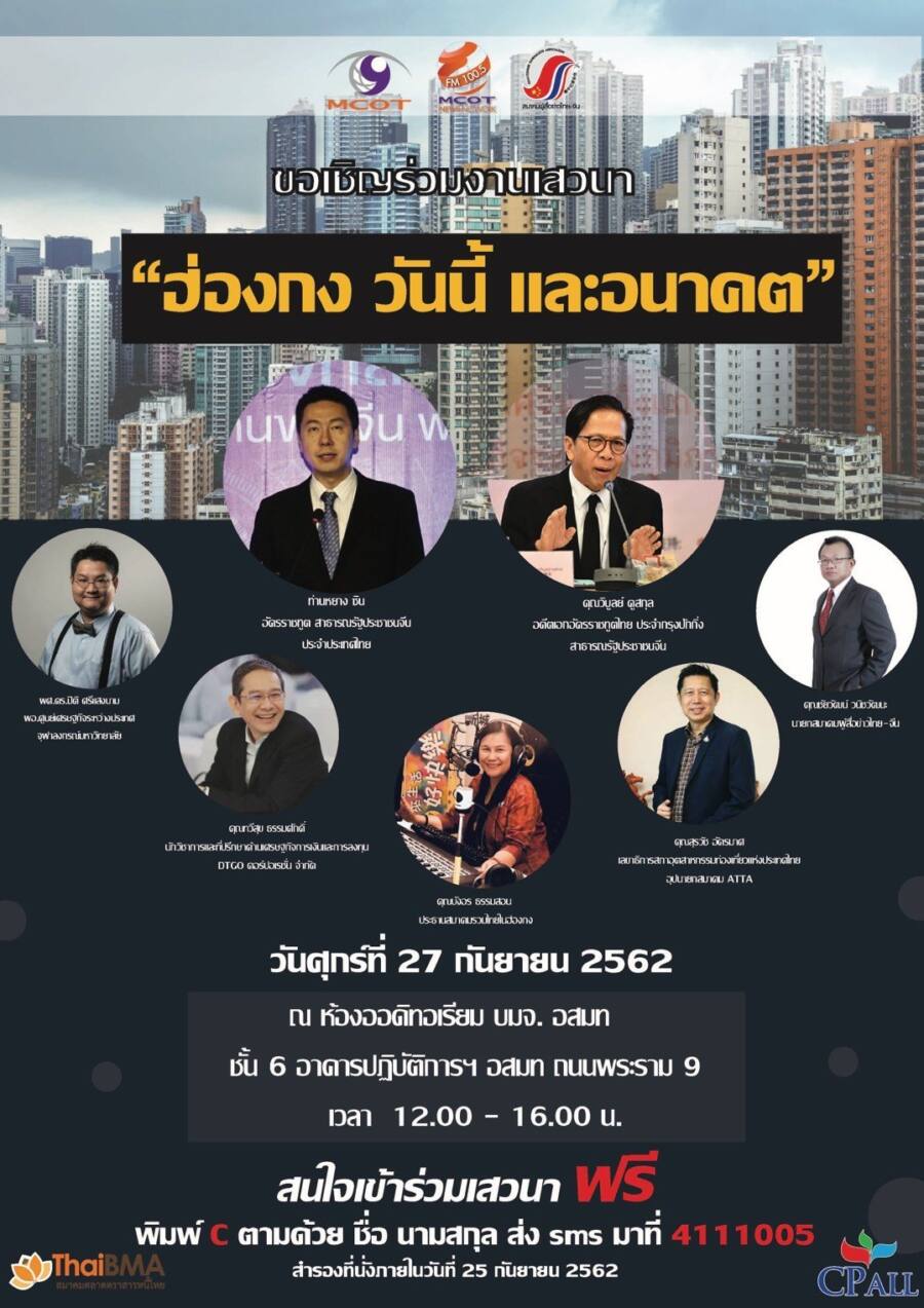 ขอเชิญฟังเสวนา“ฮ่องกง วันนี้ และอนาคต” เปิดเวทีร่วมแลกเปลี่ยนประเด็นร้อนที่ทั่วโลกจับตามอง