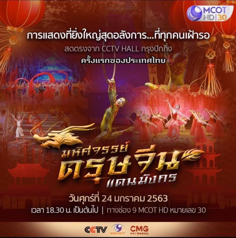 ปีนี้ MCOT ของประเทศไทยจึงสร้างปรากฎการณ์ถ่ายทอดสดเทศกาลตรุษจีน 2 วันติดกัน โดยวันศุกร์ที่ 24 มกราคม ถ่ายทอดสดเทศกาลตรุษจีนยิ่งใหญ่จากปักกิ่ง ตั้งแต่เวลา 18.30-19.30น และอีกช่วงเวลา 21.00-24.00น และวันเสาร์ที่ 25 มกราคม MCOTHD ถ่ายทอดสดพิธีเสด็จพระราชดำเนินเปิดเทศกาลตรุษจีน ประเทศไทย ที่เยาวราช ตั้งแต่เวลา 18.00 น เป็นต้นไป
