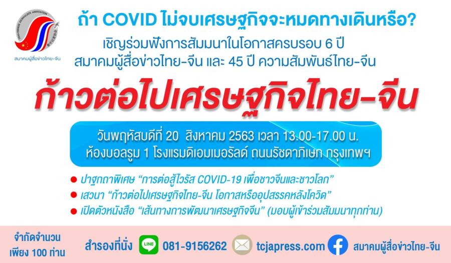 กิจกรรมสมาคมฯ ก้าวต่อไปเศรษฐกิจไทย-จีน 23 กรกฎาคม 2020 113 FacebookTwitterWhatsAppTelegramLINE ขอเชิญร่วมฟังการสัมมนาในโอกาสครบรอบ 6 ปี สมาคมผู้สื่อข่าวไทย-จีน ในโอกาส 45 ปีความสัมพันธ์ไทย-จีน “ก้าวต่อไปเศรษฐกิจไทย-จีน” วันพฤหัสบดีที่ 20 สิงหาคม 2563 เวลา 13.00-17.00 น. ณ ห้องบอลรูม 1 โรงแรมดิเอมเมอรัลด์ รัชดาฯ