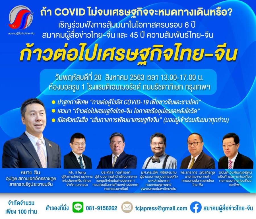นายชัยวัฒน์ วนิชวัฒนะ นายกสมาคมผู้สื่อข่าวไทย-จีน เปิดเผยว่า ในโอกาสครบรอบ 6 ปี ก้าวสู่ปีที่ 7 ของ “สมาคมผู้สื่อข่าวไทย-จีน” และการครบรอบ 45 ปีของการสถาปนาความสัมพันธ์ทางการทูตระหว่างราชอาณาจักรไทยกับสาธารณรัฐประชาชนจีน คณะกรรมการสมาคมฯเห็นสมควรจัดการสัมมนาเรื่อง “ก้าวต่อไปเศรษฐกิจไทย-จีน” ในวันพฤหัสบดีที่ 20 สิงหาคม 2563 เวลา 13.00-17.00 น. ที่ห้องบอลรูม 1 โรงแรมดิเอมเมอรัลด์ ถนนรัชดาภิเษก กรุงเทพฯ เพื่อร่วมนำพาประเทศไทยและจีนให้ก้าวผ่านนานาอุปสรรคอันเนื่องจากการแพร่ระบาดของไวรัส COVID-19