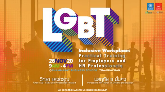 คณะพาณิชยศาสตร์และการบัญชี ธรรมศาสตร์ (Thammasat Business School) โดยศูนย์ให้คำปรึกษาและพัฒนาผู้บริหารทางธุรกิจแห่งมหาวิทยาลัยธรรมศาสตร์ (Consulting Networking and Coaching Center – CONC Thammasat) จึงจัดทำ “โครงการอบรมหลักสูตร LGBT Inclusive Workplace: A Practical Training for Employers and HR Professionals” ขึ้น