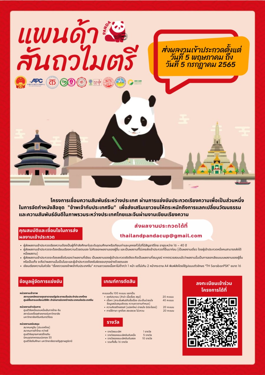 สถานเอกอัครราชทูตสาธารณรัฐประชาชนจีนประจำประเทศไทย และ ศูนย์สื่อสารเอเชียแปซิฟิก สำนักสารนิเทศต่างประเทศแห่งประเทศจีน ขอเชิญผู้สนใจที่ศึกษาระดับอุดมศึกษาอยู่ และ ผู้สนใจทั่วไปที่มีอายุระหว่าง 16-40 ปี ร่วมประกวดเรียงความหัวข้อ “เรื่องราวของข้าพเจ้ากับประเทศจีน” เป็นภาษาไทย ความยาว 1-2 หน้ากระดาษ โดยส่งผลงานก่อนวันที่ 5 กรกฏาคม 2565 ทางอีเมล thailandpandacup@gmail.com