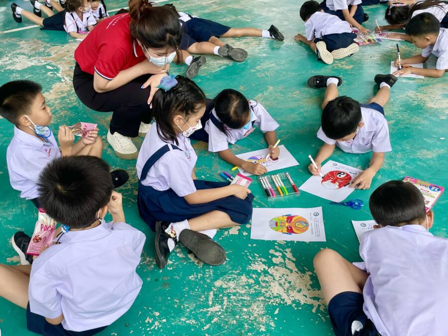 คุณครูผู้สอนกิจกรรมถักเชือกจีนและการตัดกระดาษจีน ได้สาธิตวิธีทำแบบง่ายๆ ให้กับนักเรียน จากนั้นจึงค่อยๆ สอนนักเรียนเป็นขั้นตอน เกี่ยวกับวิธีการถักเชือกจีน และการตัดกระดาษจีนอันประณีต