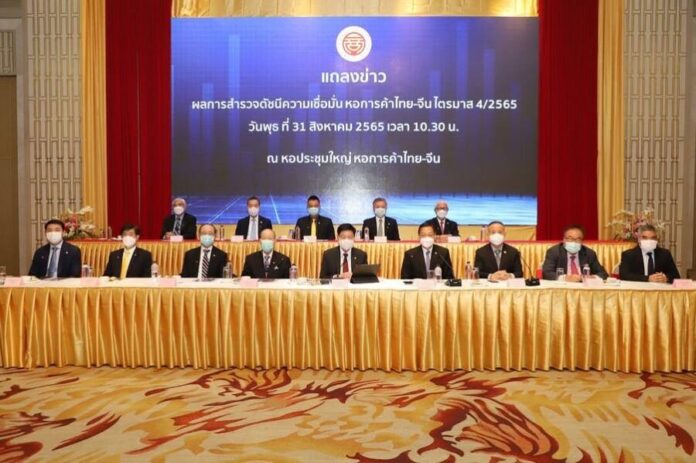 31 สิงหาคม 2565 – นายณรงค์ศักดิ์ พุทธพรมงคล ประธานกรรมการ หอการค้าไทย-จีน เปิดเผยว่า หอการค้าไทย-จีน และคณะเศรษฐศาสตร์ จุฬาลงกรณ์มหาวิทยาลัย ได้ทำการสำรวจดัชนีความเชื่อมั่น จาก คณะกรรมการกิตติมศักดิ์ คณะกรรมการบริหาร และสมาชิกหอการค้าไทยจีน และประธาน ผู้บริหาร กรรมการสมาพันธ์หอการค้าไทยจีน และกลุ่มนักธุรกิจรุ่นใหม่หอการค้าไทยจีน จำนวน 305 คน ระหว่างวันที่ 16 ถึง 18 สิงหาคม 2565 เพื่อคาดการณ์ทิศทางเศรษฐกิจในไตรมาสที่ 4 ของปี 2565 ได้ดังนี้