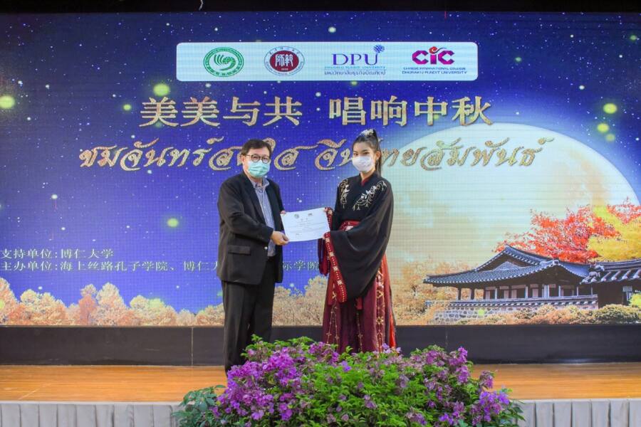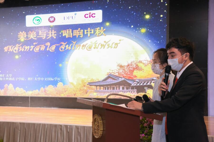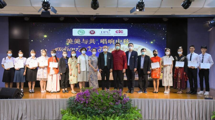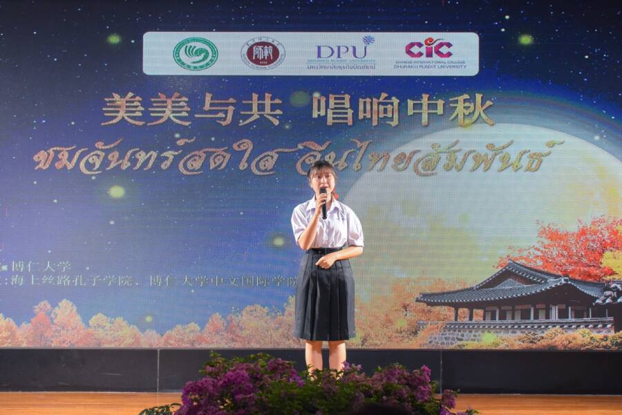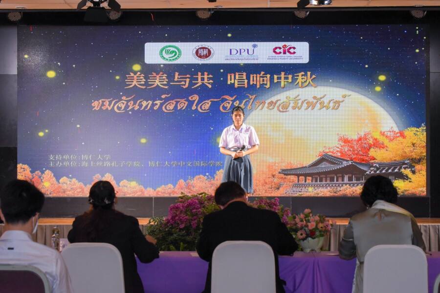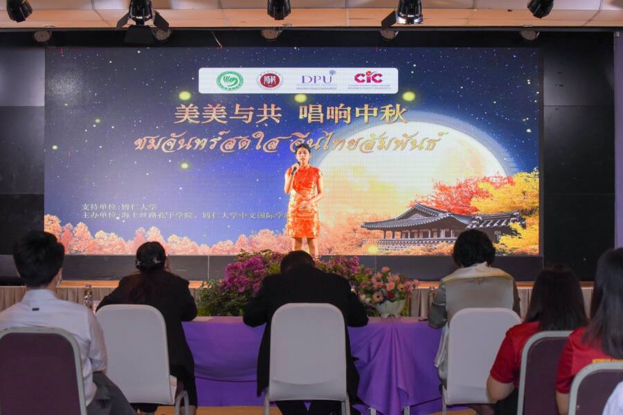 วันพฤหัสบดีที่ 8 กันยายน 2565 สถาบันขงจื่อเส้นทางสายไหมทางทะเล ร่วมกับ วิทยาลัยนานาชาติจีน มหาวิทยาลัยธุรกิจบัณฑิตย์ (DPU) จัดกิจกรรม “ชมจันทร์สดใส จีนไทยสัมพันธ์” ณ ห้องประชุมสนม สุทธิพิทักษ์ มหาวิทยาลัยธุรกิจบัณฑิตย์ ซึ่งเป็นกิจกรรมประกวดร้องเพลงที่มีผู้เข้าแข่งขันกว่า 90 คนจากทั่วประเทศ โดยหลังจากผู้เข้าแข่งขันได้ผ่านการคัดเลือกถึง 2 รอบ มีผู้เข้าแข่งขันที่ผ่านการคัดเลือกเพียง 10 คนได้เข้ารอบชิงชนะเลิศในวันนี้