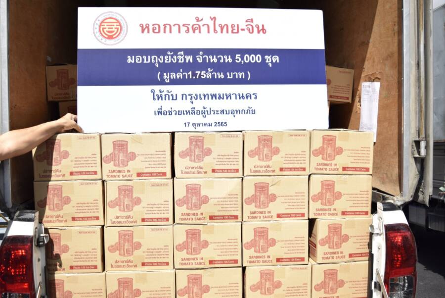 ต่อมาเมื่อวันที่ 21-22 ตุลาคม 2565 หอการค้าไทย-จีน ได้ดำเนินการส่งมอบสินค้าอุปโภคบริโภค ไปยัง กทม. เช่น ข้าวสาร (ถุงละ 5 กก. จำนวน 5,000 ถุง) บะหมี่กึ่งสำเร็จรูป (100,000 ซอง) ปลากระป๋อง (20,000 กระป๋อง) และน้ำพริกเผา (5,004 กระป๋อง) พร้อมถุงยังชีพ 5,000 ใบ สำหรับบรรจุสิ่งของบริจาค เพื่อ กทม. จะนำไปแจกจ่ายบรรเทาทุกข์ผู้ประสบภัยในกรุงเทพมหานคร ต่อไป
