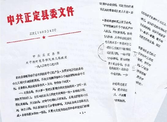 คำประกอบภาพ คณะกรรมการพรรคคอมมิวนิสต์จีนประจำอำเภอเจิ้งติ้ง ประกาศ”ข้อบังคับ 6 ประการ” เกี่ยวกับการปรับปรุงบทบาทเจ้าหน้าที่และสมาชิกพรรคเมื่อวันที่ 6 ธันวาคมปี 1983