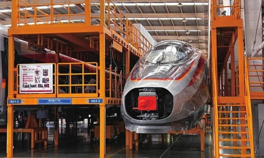 Stepping into the assembly workshop, multiple orange-colored CR400AF-Z EMU trains, also known as the Fuxing bullet train, were lined up in an orderly fashion, sparking palpable interest and enthusiasm among the journalists.