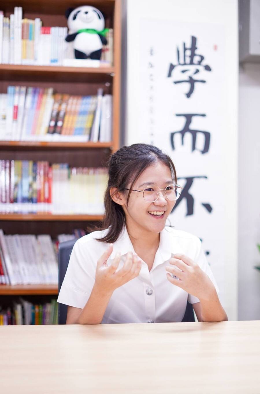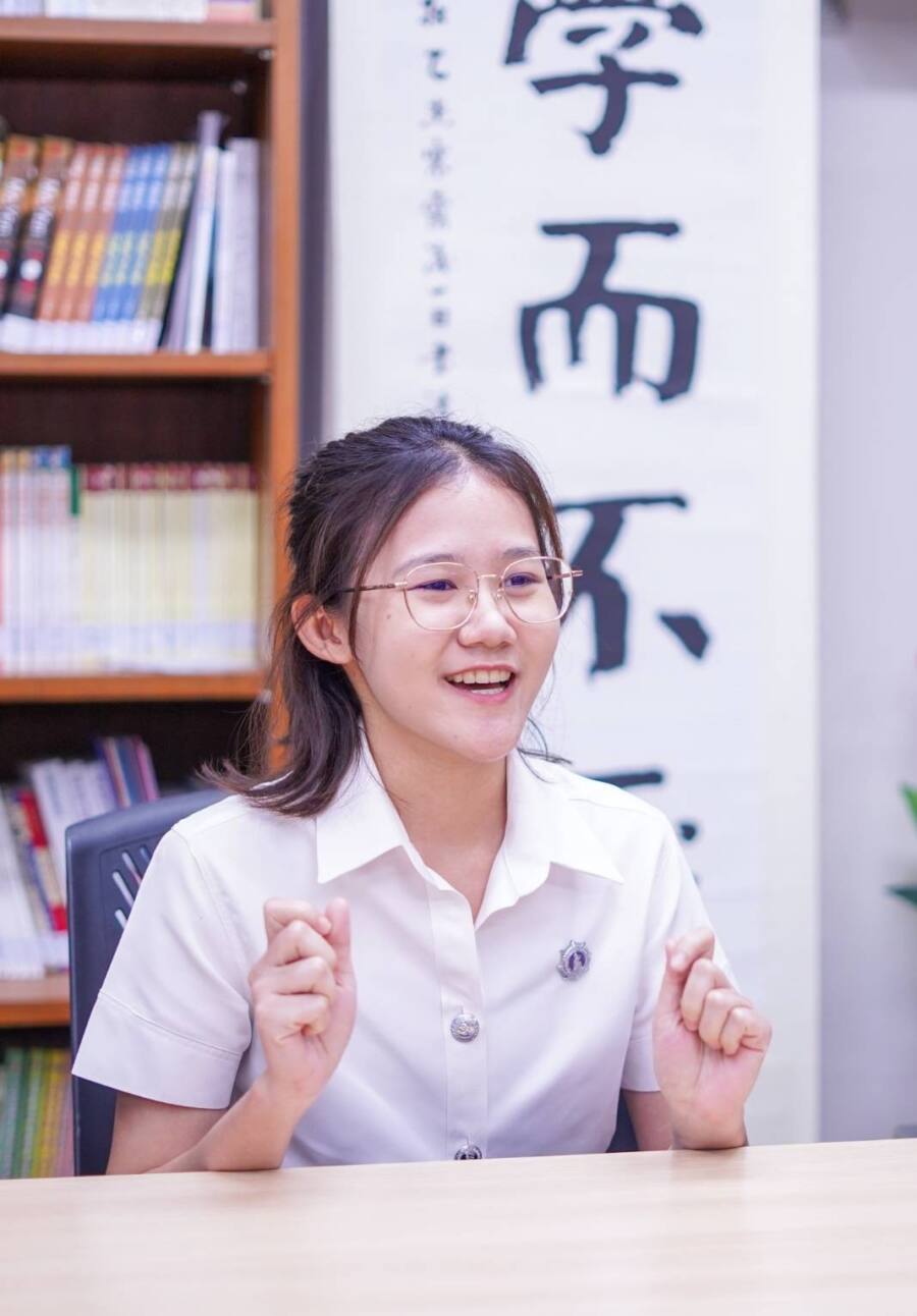 “ตอนจะเข้ามหาวิทยาลัย หนูยังไม่แน่ใจว่าอยากเรียนอะไร พอปิดเทอมหนูก็เลยเปิดหาอะไรดูไปเรื่อยเปื่อย จนได้เข้ามาดูซีรีส์จีน แล้วก็รู้สึกว่าสำเนียงที่เขาพูดมันไพเราะมาก ก็เลยไปลงเรียนคอร์สพิเศษภาษาจีน เริ่มเรียนพวกพินอิน รู้สึกว่าง่าย อยากเรียนต่อด้านภาษาจีน โดยที่ไม่รู้ว่าจริง ๆ แล้วมันยากมาก”