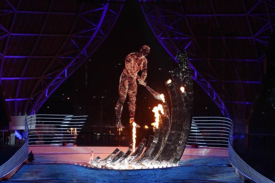 อดีตและปัจจุบันส่องประกายบ่งบอกถึงอนาคต เริ่มต้นจากซากเมืองโบราณเหลียงจู่ซึ่งเป็นเครื่องพิสูจน์ประวัติศาสตร์อารยธรรมจีนกว่า 5,000 ปี จุดคบเพลิงหลักเอเชียนเกมส์ด้วยไฟดิจิทัล มาบรรจบกันเป็นไฟศักดิ์สิทธิ์ของเอเชียนเกมส์ที่ลุกโชติช่วง เราได้เห็นถึงปณิธานเดิมของอายรธรรมที่ว่าเราจะประสบความสำเร็จได้เสมอถ้าไม่ลืมเจตนารมณ์เดิม เห็นถึงบรรยากาศจีนที่มีโฉมใหม่ เห็นถึงการรอคอยของชาวเอเชียที่มีหัวใจเชื่อมโยงกันหลายพันไมล์ ประกายไฟเล็กๆ น้อยๆ ที่รวมกันเหมือนคบไฟ ผู้ถือคบเพลิงออนไลน์มากกว่า 100 ล้านคนร่วมกันจุดคบเพลิงพิธีเปิดอันยิ่งใหญ่ ไม่ว่าคุณหรือผมที่เป็นคนธรรมดา ล้วนเป็นผู้ร่วมและเป็นสักขีพยานในงานใหญ่ครั้งนี้