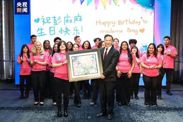 วันที่ 16 พฤศจิกายน สถานีวิทยุและโทรทัศน์ส่วนกลางแห่งชาติจีนหรือไชน่า มีเดีย กรุ๊ป กับสมาคมนักเรียนแลกเปลี่ยนสหรัฐฯ-จีน และสมาคมอื่นๆ ร่วมกันจัดกิจกรรมการเจรจาการแลกเปลี่ยนมิตรภาพด้านมนุษยศาสตร์ระหว่างจีนกับสหรัฐฯ ที่นครซานฟรานซิสโก คณะนักร้องประสานเสียงของโรงเรียนมัธยมลินคอล์นในเมืองทาโคมา รัฐวอชิงตัน ของสหรัฐ ได้จัดเตรียมภาพวาดด้วยมืออย่างพิถีพิถันให้กับปธน.สี จิ้นผิง และมาดามเผิง ลี่หยวน โดยอวยพรวันเกิดให้กับมาดามเเผิง ลี่หยวน ด้วยการ์ดอวยพรวันเกิดและเพลงประสานเสียง ผู้อำนวยการไชน่า มีเดีย กรุ๊ปเป็นผู้รับมอบในกิจกรรม นักเรียนของคณะนักร้องประสานเสียงโรงเรียนมัธยมลินคอล์นได้ส่งภาพวาดที่วาดด้วยมือซึ่งเป็นสัญลักษณ์ของมิตรและสันติภาพ “สู่อนาคตร่วมกัน” ภาพแสดงให้เห็นถึงความปรารถนาและความรักที่ครูและนักเรียนของโรงเรียนมัธยมลินคอล์นที่มีต่อประเทศจีน และความปรารถนาอย่างกระตือรือร้นต่อมิตรภาพระหว่างจีนกับสหรัฐฯ ให้คงอยู่ตลอดไป และวาดด้วยมือเพื่ออนาคตที่สดใส