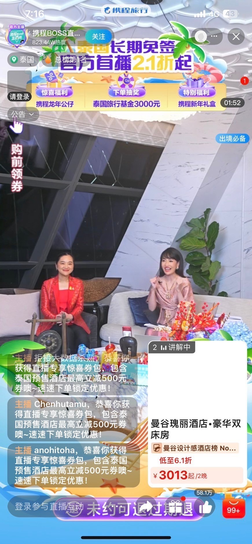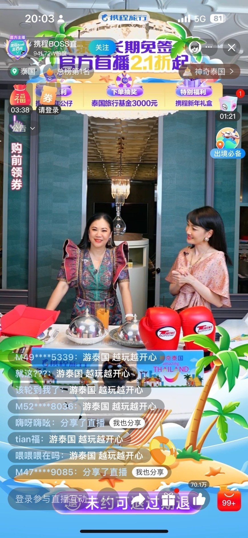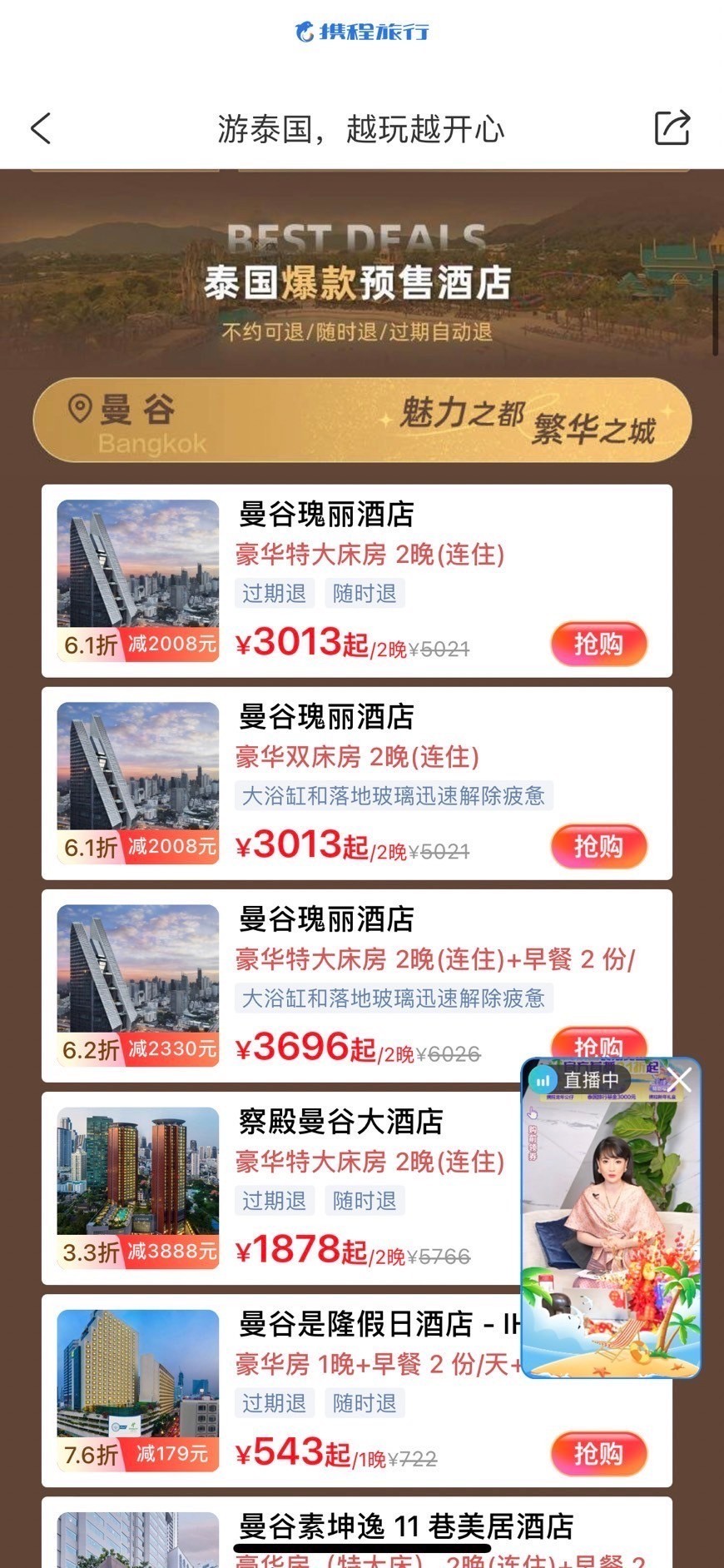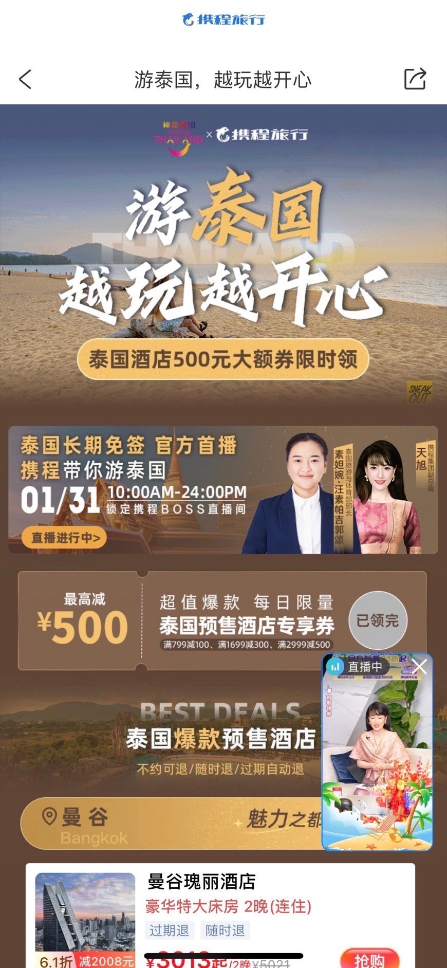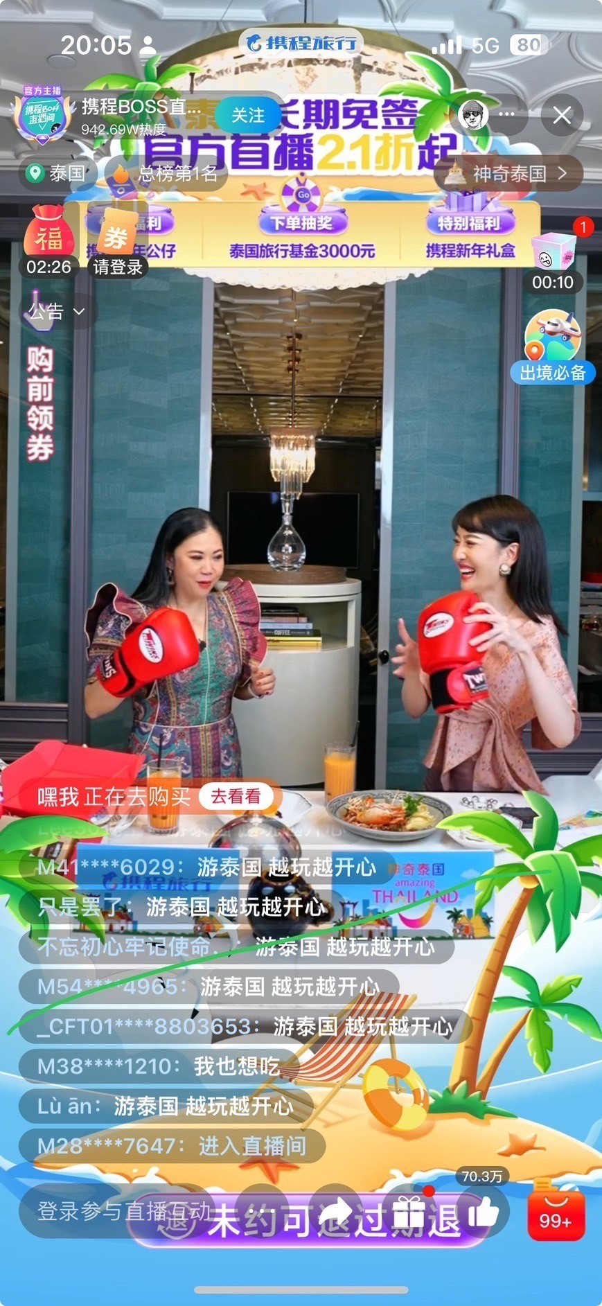 การไลฟ์สตรีมในครั้งนี้นำเสนอดีลสินค้าและบริการด้านการท่องเที่ยวในประเทศไทย ทั้งส่วนลดสายการบิน โปรโมชั่นที่พัก แพ็คเกจท่องเที่ยว มุ่งเน้นทำให้ประเทศไทยเป็นจุดหมายการท่องเที่ยวชั้นนำ นำเสนอเกาะที่สวยงาม วัฒนธรรม และอาหารรสชาติดี ดำเนินรายการโดย คุณแซน เทียนซู รองประธาน Trip.com Group ซึ่งกล่าวไว้ว่า การไลฟ์สตรีม เป็นเครื่องมือการตลาดที่ได้รับความสนใจจากนักท่องเที่ยวจีน เนื่องจากประเทศไทยเป็นตลาดที่สำคัญสำหรับกลุ่ม Trip.com โดยกรุงเทพฯ เป็นจุดหมายปลายทางการท่องเที่ยวยอดนิยมที่สุดในภูมิภาคเอเชียตะวันออกเฉียงใต้สำหรับนักท่องเที่ยวจีนในปี 2566 ในขณะที่ภูเก็ตและเชียงใหม่ติดอยู่ใน 10 อันดับด้วย มีปริมาณการจองในปี 2566 เพิ่มขึ้น 174% (เทียบกับปีก่อน) และคาดว่าจะยังคงเป็นปลายทางท่องเที่ยวที่สำคัญอย่างต่อเนื่องในปี 2567 นี้