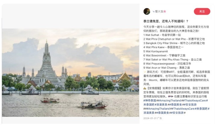 ภายใต้การดำเนินโครงการ Thais Always Care คนไทยใส่ใจเสมอ ททท. ประชาสัมพันธ์เชิงรุกด้วยการใช้ Influencer Marketing จัดทำคอนเทนต์พร้อมนำเสนอสินค้าและบริการทางการท่องเที่ยวมิติต่าง ๆ ได้แก่ Food, Faith, Soft Power, Leisure, และ Shopping เพื่อสร้างประสบการณ์การท่องเที่ยวเหนือระดับในเมืองท่องเที่ยวยอดนิยม อาทิ กรุงเทพมหานคร พระนครศรีอยุธยา เชียงใหม่ นครปฐม พัทยา เกาะสมุย และภูเก็ต เป็นต้น เผยแพร่ โดย KOLs ชาวต่างชาติที่มีชื่อเสียง เช่น Momo โมโม่ ช่องทางประชาสัมพันธ์ 七色MOMO (QiseMOMO ชีซื่อโมโม่ ) : Follower Weibo 2,067,000 ผู้ติดตาม Jiajia เจียเจีย ช่องทางประชาสัมพันธ์ 佳佳仁啊 (Jiajiarena เจียเจียเหรินอา) : Follower Weibo 3,645,000 ผู้ติดตาม Weiwei เว่ยเว่ย ช่องทางประชาสัมพันธ์ 微微旅行 (Weiweiluxing เวยเวยหลู่สิง) : Follower Weibo 2,038,000 ผู้ติดตาม Anastasiia Romakh ช่องทางประชาสัมพันธ์ anastasia_romakh : Follower Instagram 1,502,440 ผู้ติดตาม Irina Kolesnikova ช่องทางประชาสัมพันธ์ Irina Kolesnikova : Follower Instagram 796,000 ผู้ติดตาม Travis Leon Price ช่องทางประชาสัมพันธ์ travisleon1 : Follower Instagram 190,000 ผู้ติดตาม Alex Loktionov ช่องทางประชาสัมพันธ์ loktitravel : Follower Instagram 88,100 ผู้ติดตาม ผ่านแพลตฟอร์มสื่อสังคมออนไลน์ชั้นนำ อาทิ Weibo, Douyin, Xiaohongshu Instagram, Tiktok เป็นต้น