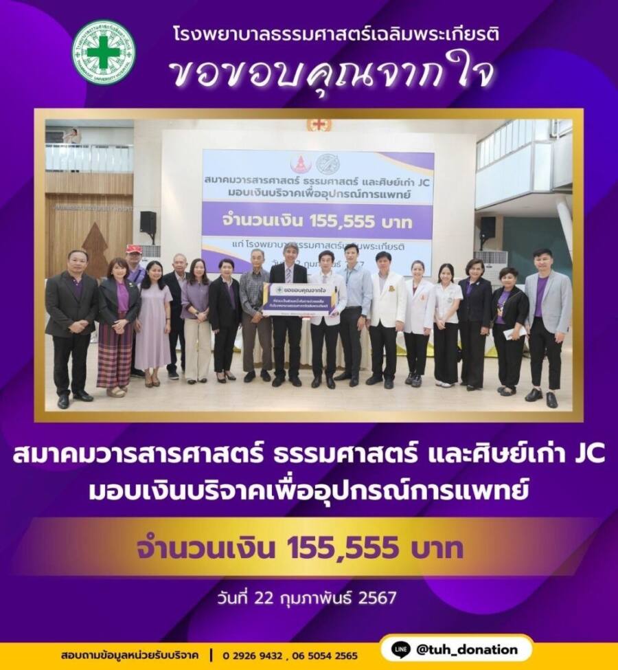 สำหรับเงินจำนวน 185,555 บาท ที่มอบให้กับโรงพยาบาลธรรมศาสตร์เฉลิมพระเกียรติในครั้งนี้ จะใช้เพื่อการจัดซื้ออุปกรณ์ทางการแพทย์ที่จำเป็นในการช่วยเหลือประชาชนที่เจ็บป่วยต่อไป