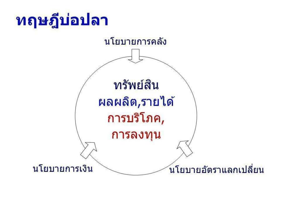 ศาสตราจารย์ ดร.สุชาติ ชี้ให้เห็นถึงการบริหารระบบเศรษฐกิจ โดยใช้ทฤษฎีบ่อปลา เปรียบเหมือนการดูแลปริมาณน้ำในบ่อปลา ปลาแต่ละตัวคือองค์กรธุรกิจหรือประชาชน มีหน้าที่บริหารและดูแลตัวเอง แต่การบริหารระบบเศรษฐกิจนั้น ไม่เหมือนกับการบริหารธุรกิจ เพียงรัฐบาลดูแลน้ำในบ่อให้เต็มที่เพียงพอ ไม่ให้ล้นบ่อ เพื่อให้ปลาสามารถเจริญเติบโตได้อย่างเต็มที่ที่สุด ซึ่งเป็นทฤษฎีหนึ่ง ในวิชาเศรษฐศาสตร์มหภาค (Macroeconomics) การบริหารระบบเศรษฐกิจเหมือนการบริหารน้ำในบ่อปลา มีทางเข้า-ออกของน้ำในบ่อ 3 ทาง คือ นโยบายการคลัง(Fiscal Policy) นโยบายการเงิน ( Monetary Policy) และนโยบายอัตราแลกเปลี่ยน (Exchange Rate Policy) โดยนโยบายการคลัง (Fiscal Policy) จะมีผลต่ออัตราการเจริญเติบโตทางเศรษฐกิจน้อยที่สุด เพราะรัฐบาลต้องไปดูดปริมาณเงินออกจากระบบเศรษฐกิจด้วยการเก็บภาษี แล้วใส่กลับเข้าไปด้วยการใช้จ่ายของรัฐบาลหรืออาจไปกู้ยืมเงินมาใช้จ่ายก่อน แล้วเก็บภาษีคืนในอนาคต หากรัฐบาลมีปัญหาคอรัปชั่น การใช้จ่ายไม่มีประสิทธิภาพ ก็จะยิ่งมีผลต่อระบบเศรษฐกิจน้อยลงไปอีก จนบางครั้งการลดรายจ่ายรัฐบาล แล้วลดภาษีในจำนวนเท่ากัน อาจมีผลต่อการเจริญเติบโตทางเศรษฐกิจมากกว่า เพราะเงินภาษีที่ลดให้ประชาชนนั้น จะอยู่ในมือเจ้าของเงินผู้หารายได้ ซึ่งเขาจะใช้เงินของเขาเองอย่างมีประสิทธิภาพตรงเป้าหมายมากที่สุด ซึ่งจะทำให้ระบบเศรษฐกิจเจริญเติบโตได้สูงกว่าการที่รัฐบาลนำเงินของเขาไปใช้จ่ายอย่างไม่ระมัดระวัง
