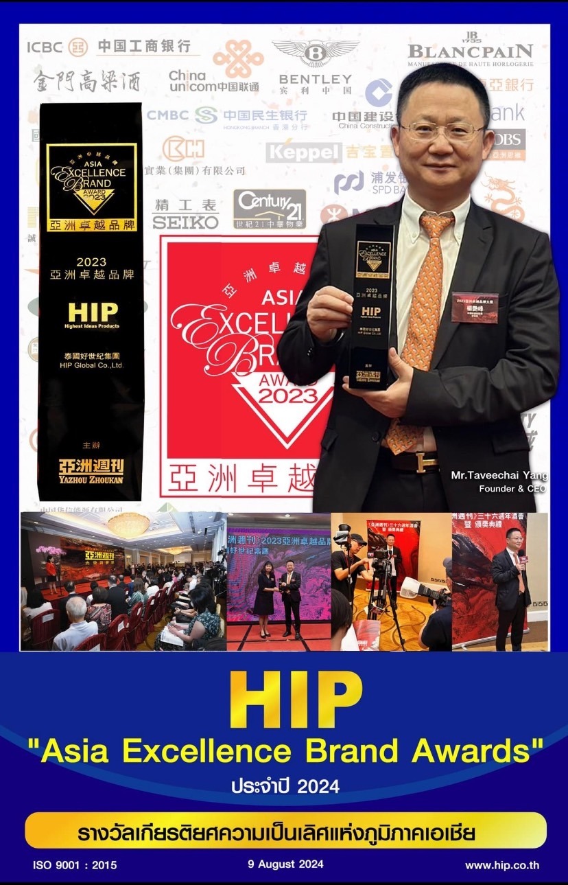 โดยนายทวีชัย หยาง ผู้ก่อตั้งและ CEO ของ บริษัท เอช ไอ พี โกลบอล จำกัด (HIP GLOBAL) ได้รับเกียรติรับรางวัลจากเวที “Asia Excellence Brand Awards” ประจำปี 2024 ในวันที่ 9 สิงหาคม โดยนิตยสาร Yazhou Zhoukan (Asia Weekly) สื่อชั้นนำด้านการเมือง เศรษฐกิจ การเงิน และวัฒนธรรมระดับนานาชาติ ของฮ่องกงและเอเชีย ด้วยการเติบโตทางเศรษฐกิจอย่างรวดเร็วในเอเชียและการพัฒนาอย่างต่อเนื่อง สะท้อนการเป็นองค์กรธุรกิจที่ยึดมั่นหลักธรรมาภิบาลที่ดี ควบคู่ไปกับการสร้างความมั่นคงทางเทคโนโลยีที่ยั่งยืนให้แก่ผู้บริโภค ผ่านการพัฒนาเพื่อสังคม และสิ่งแวดล้อม ตามเป้าหมายการพัฒนาที่ยั่งยืนจนเป็นที่ยอมรับในระดับสากล