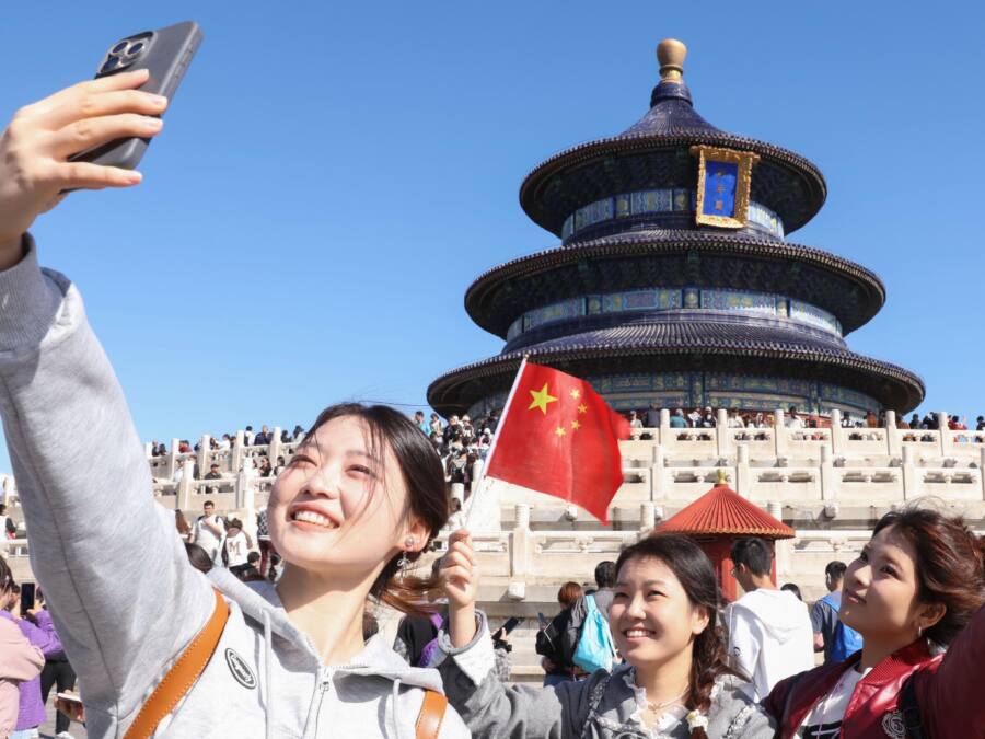 (แฟ้มภาพซินหัว : นักท่องเที่ยวถ่ายรูปคู่กับหอเทียนถานในกรุงปักกิ่ง เมืองหลวงของจีน วันที่ 1 ต.ค. 2024)